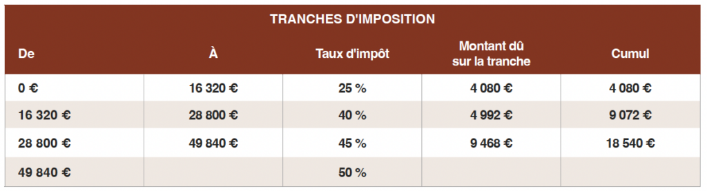 Sans tenir compte de la quotité exemptée (voir § ci-dessus), l’impôt dû sur un revenu de 60 000 € est donc de 18 540 € + 50 % de (60 000 € – 49 840 €) = 23 620 €, ce qui correspond à un taux moyen de 39,37 %.