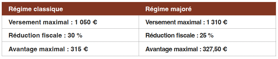 Si le versement dépasse 1 050 €, la réduction de 25 % s’applique à l’ensemble du montant. Notre conseil : privilégiez le régime classique. Dans le régime majoré, le gain d’impôt pour une épargne supplémentaire de 260 € n’est que de 12,50 €.